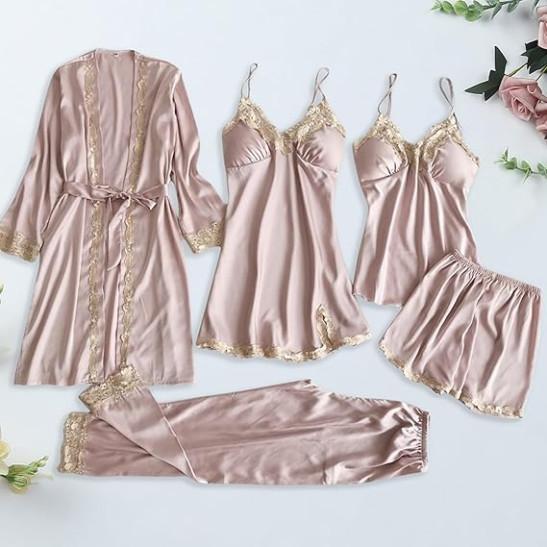 5 Piece Pajama Set Women Sexy Pajamas Set Silk Satin Lace Sleepwear 5 Piece Lingerie Robe Gown Lightweight Nightwear Lace Nightdress Pajamas with Pants Belt Lace Trim Loungewear Gifts for Women Set