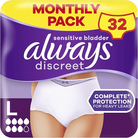 Always Discreet Incontinence Pants Women Large, UK Size 16-22, White, Absorbency 7, 32 Underwear , Disposable Maternity Knickers (8 x 4 Packs)