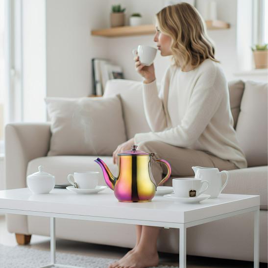 ANYGLEAM Pink Rainbow Stainless Steel Teapot – 18x14cm with Filter – Heat-Resistant Handle – For Tea, Coffee, Oil & Liquid Seasonings