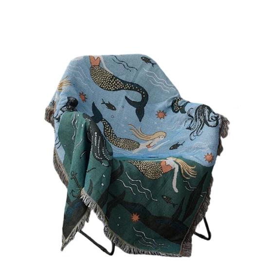 Anyhouz Throw Blanket – 130x160cm Blue Faux Cashmere Sofa Cover with Mermaid Pattern and Tassels – Soft, Lightweight Picnic or Camping Mat for Home and Travel