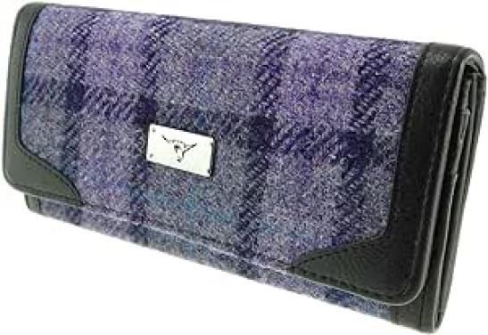Authentic Women's Harris Tweed Long Purse - Bold Purple Check Tartan - Handwoven Scottish Heritage