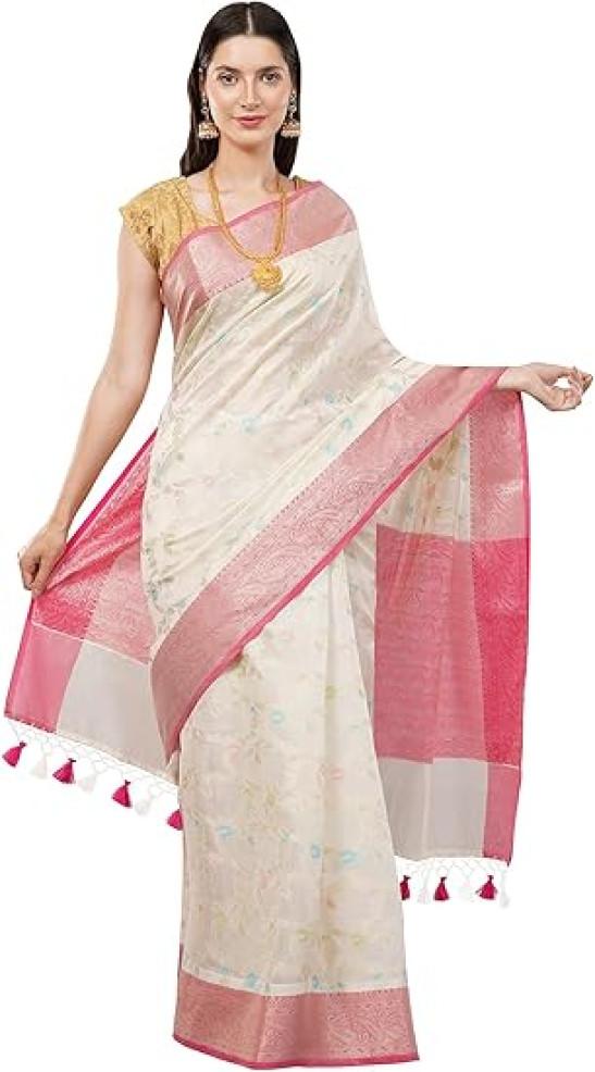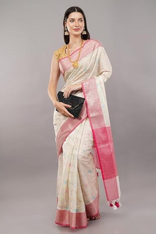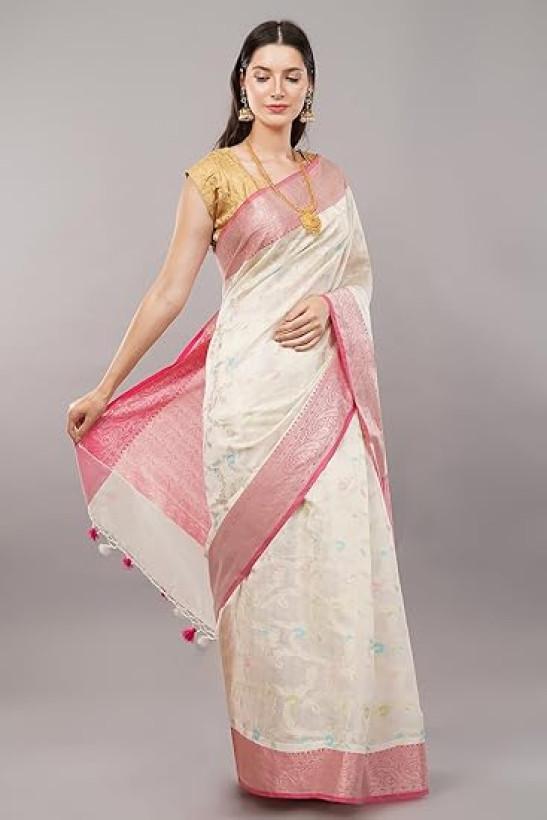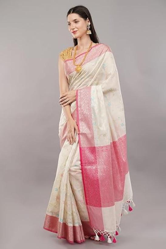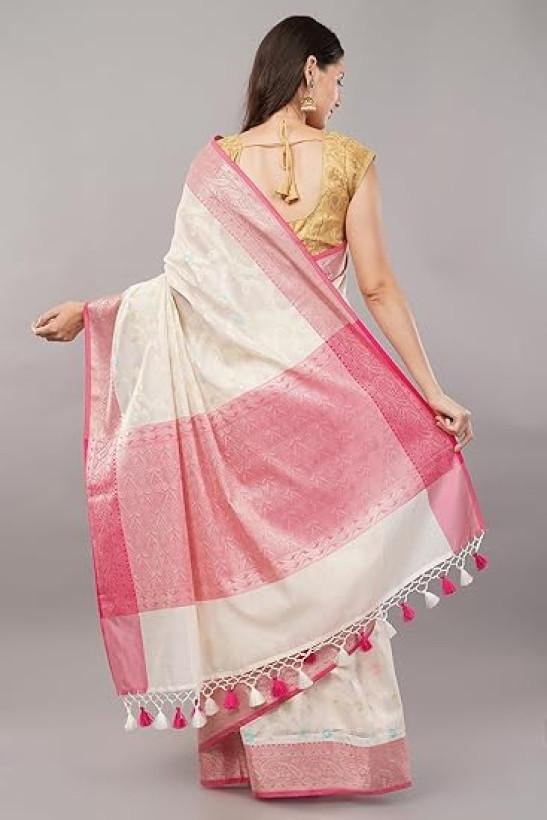 Banarsi Meenakari Cotton Silk Saree/Fall Attached/Blouse Fabric Included/Tassels Attached
