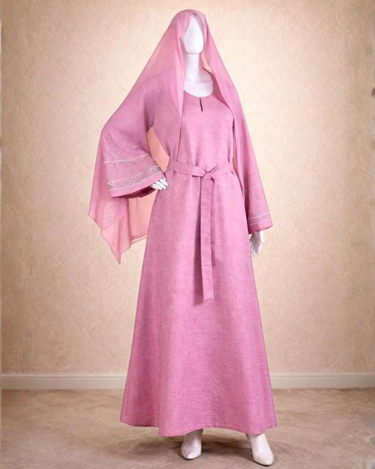Blush Pink Embroidered Belted Abaya with Sheer Matching Hijab (52)