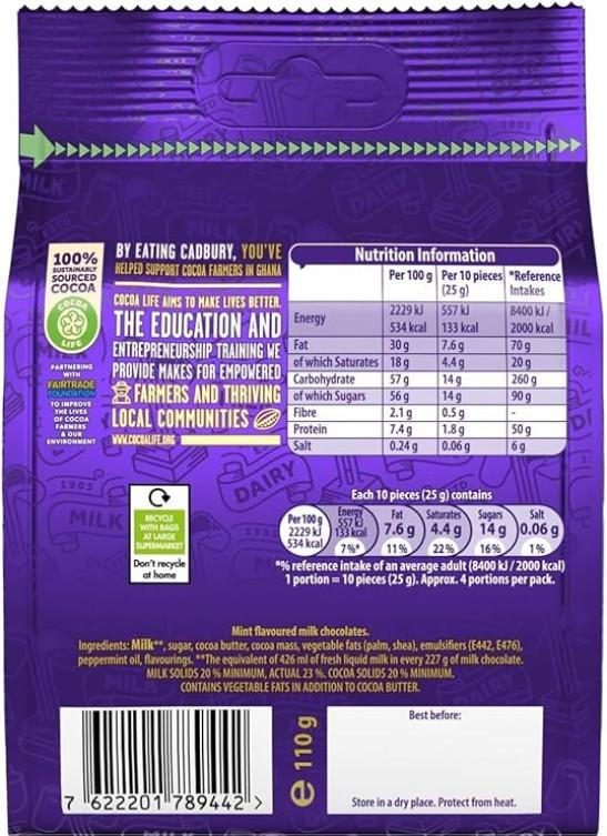 Cadbury Dairy Milk Giant Chocolate Buttons With a Hint of Mint, 110 g Bag