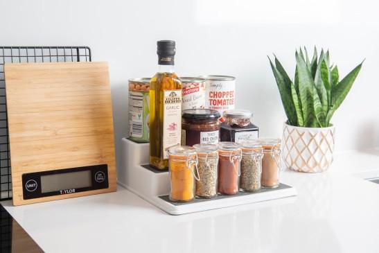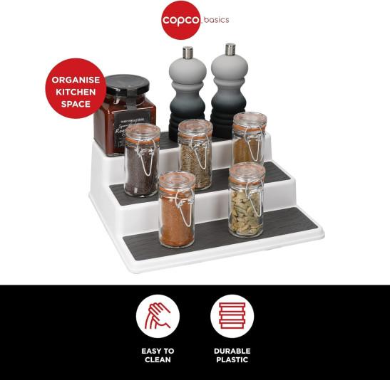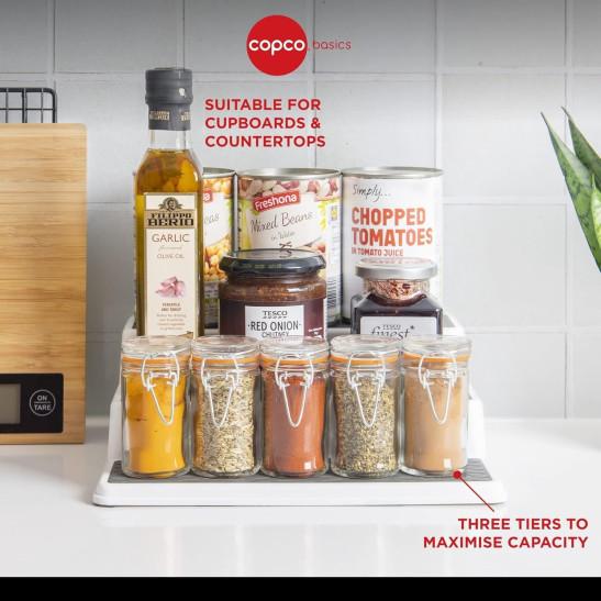 Copco Basics 3-Tier Spice Rack for Inside Cupboard, Non-Slip Kitchen Shelf Organizer, 26 x 23 x 8.5cm, White/Grey