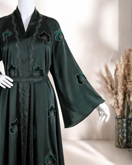 Dark Emerald Green Embroidered Open Abaya with Belt & Matching Hijab (56)