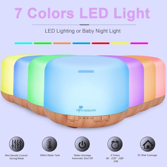 Diffuserlove Essential Oil Diffuser 500ML Remote Control Ultrasonic Aromatherapy Diffuser Cool Mist Humidifiers with Mute Design, Timer and Waterless Auto Shut-off, 7 Color LED for Office Living Room