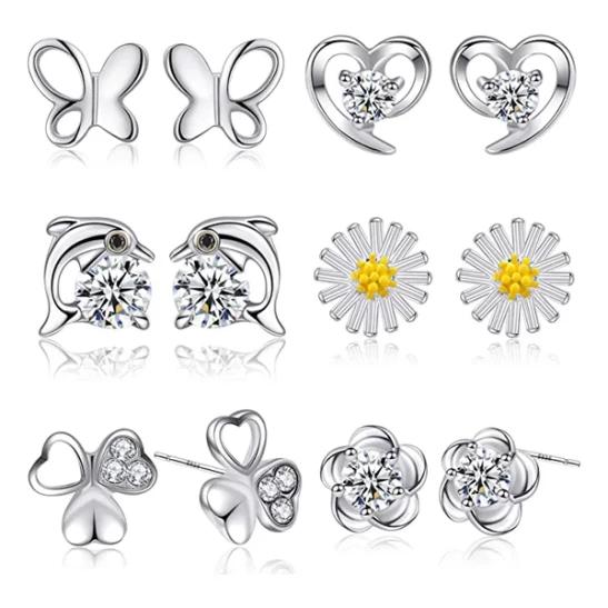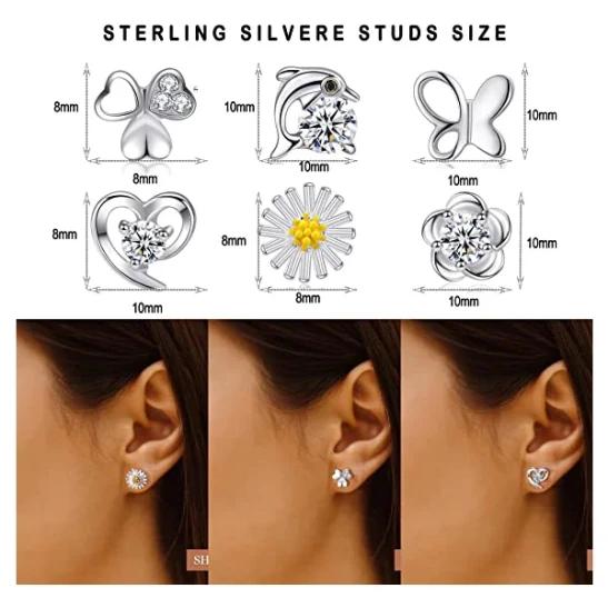 Earrings S925 Silver Stud Earrings For Women Round Heart Shape Flower Butterfly Cubic Zirconia Silver Studs For Girls Small Cartilage Stud Earrings Set