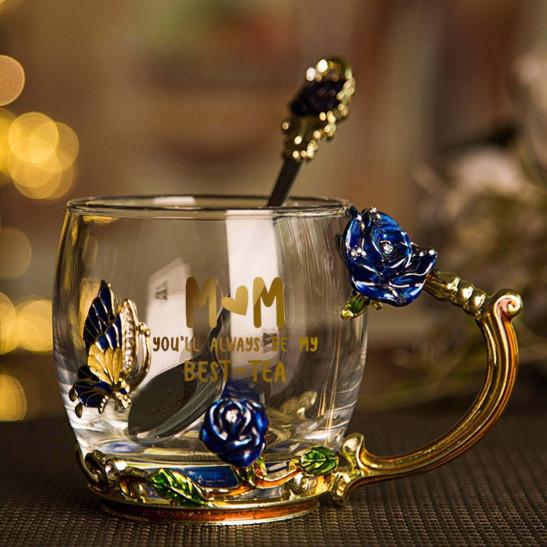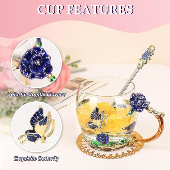 evecase Mothers Day Gifts Butterfly Flower Glass Coffee Mugs Tea Cup with Steel Spoon, Mum Gifts for Women Wife Friends Christmas Birthday Mothers Valentines Day (Mum)