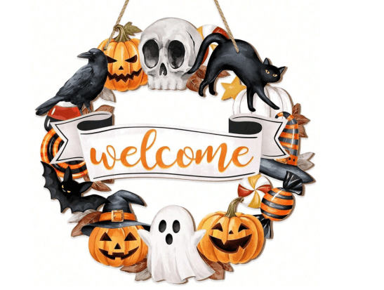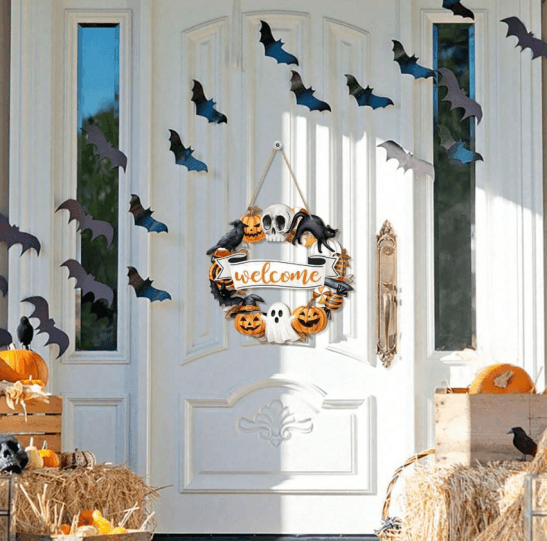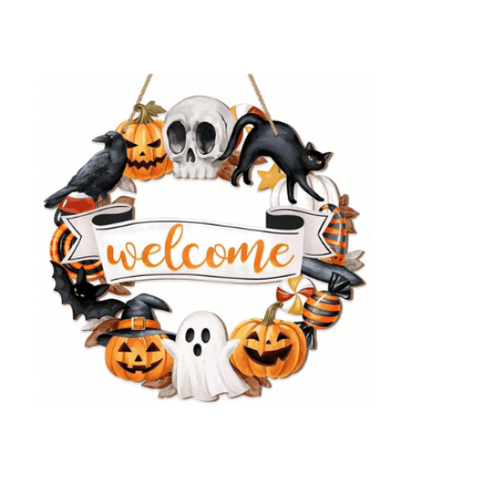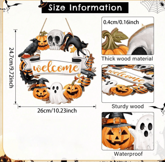 Halloween Wood Garland Ghost Black Cat Pumpkin Skull Door Listing Decoration, Country Ghost Halloween Welcome Wooden Sign Front Door Hook Home Decor Halloween Party Supplies