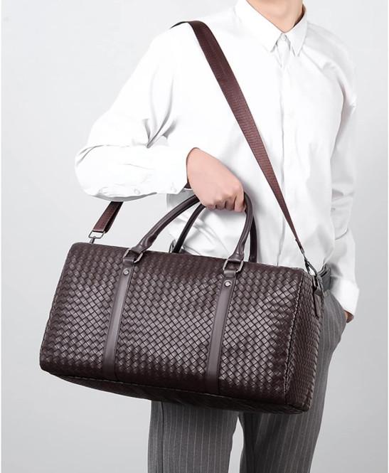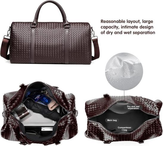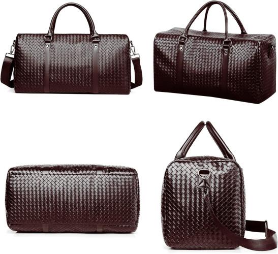 Leather Travel Duffle Bag for Men, Woven Carry On Weekender Overnight Bags for Business Sports Gym, Brown, L
