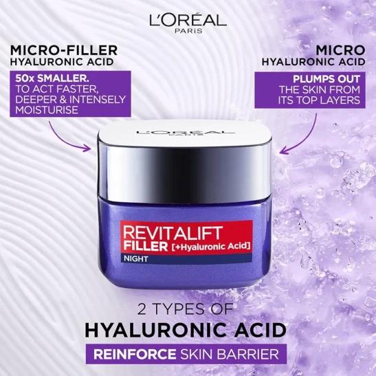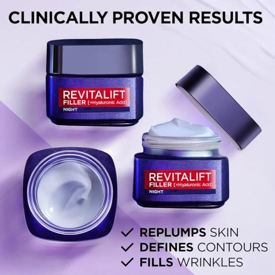 L’Oréal Paris Revitalift Filler Replumping Anti-Ageing Night Cream, Smooth Wrinkles, Moisturise, and Replumps Skin with Micro and Micro-Epidermic Hyaluronic Acid, 50ml