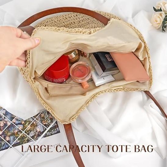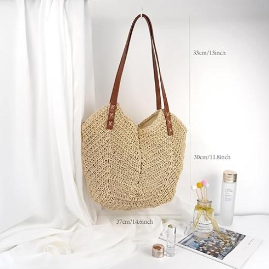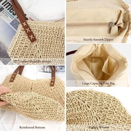 MAMUNU Straw Beach Bag for Women, Summer Straw Tote Bag Handbag with Zip Leather Handles, Retro Handmade Boho Casual Woven Travel Holiday Shoulder Bags for Beach Vacation Outdoor Shopping Daily Use