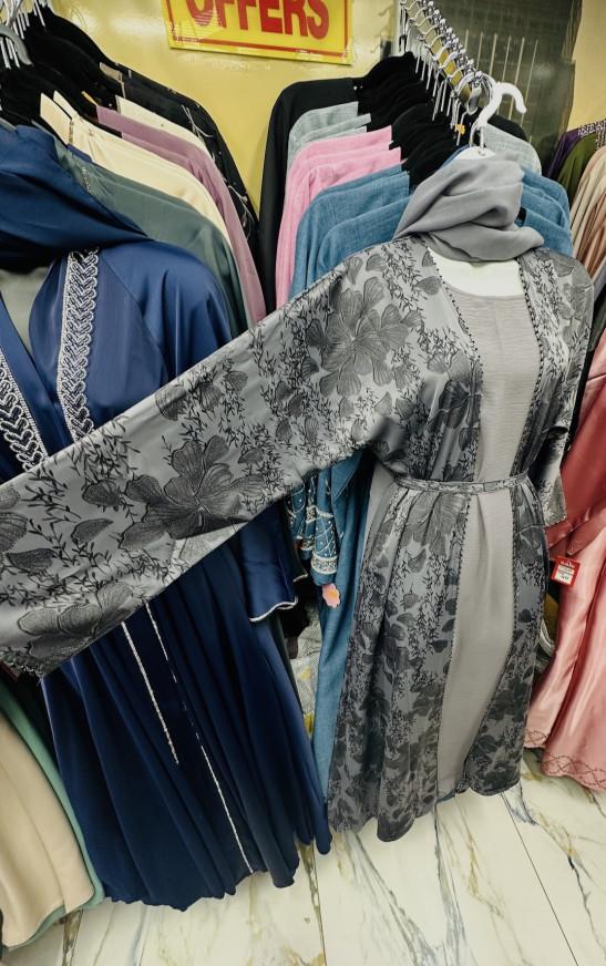 Floral Jacquard Open Abaya Set Silver Floral (52) - 3-Piece Luxury Modest Ensemble