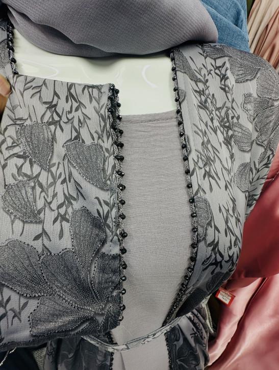 Floral Jacquard Open Abaya Set Silver Floral (58) - 3-Piece Luxury Modest Ensemble