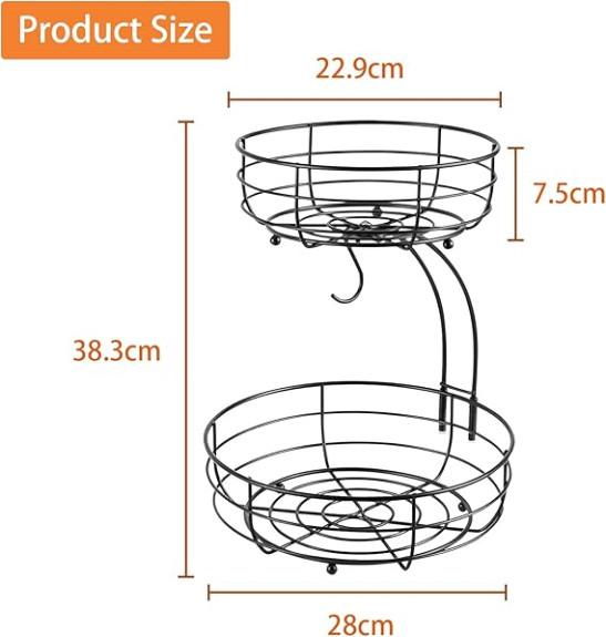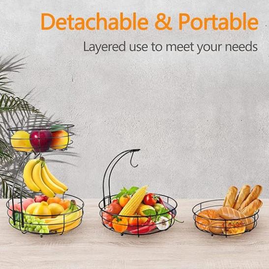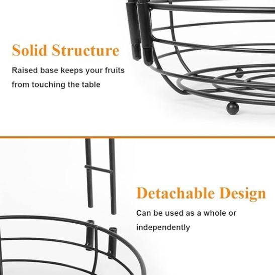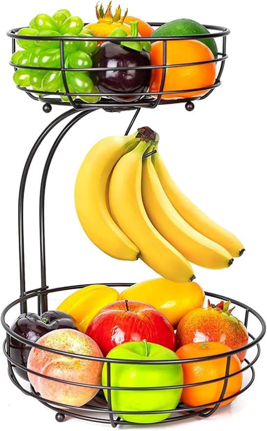 Mutool Fruit Basket, 2-Tier Fruit Bowl with Banana Hanger, Kitchen Countertop Rack, Metal Bowls Perfect for Holding Fruit, Vegetables, Snacks, Cupcakes (Black)