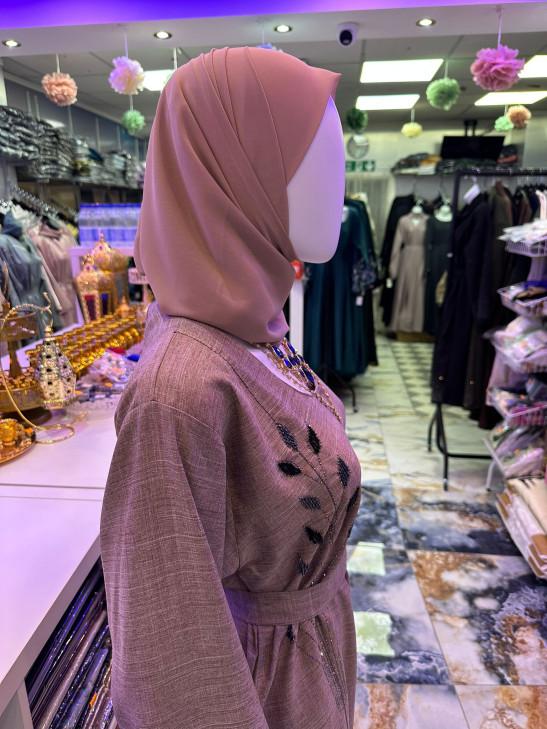 New Arrival Taupe Elegance Embroidered Abaya Beige(58) Gown with Delicate Leaf Embroidery Stylish Belt & Matching Scarf for All Seasons