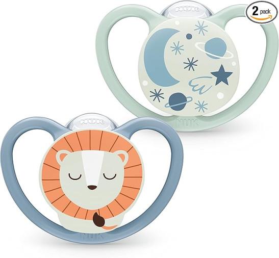NUK Space Night Baby Dummy | 0-6 Months | Glow-in-The-Dark Soothers with Extra Ventilation for Sensitive Skin | BPA-Free Silicone | Lion & Moon | 2 Count