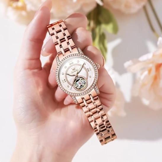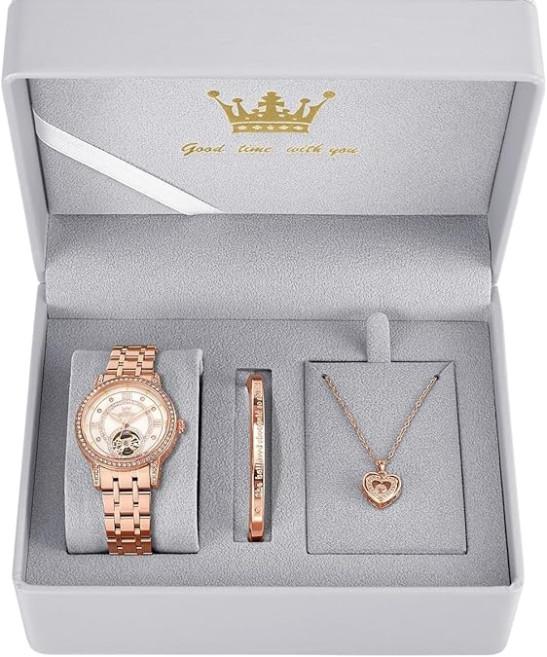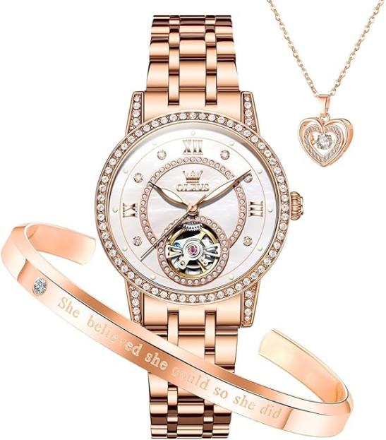 OLEVS Automatic Womens Watches Mechanical Diamond Skeleton Luxury Dress Stainless Steel Silver/Rose Gold Waterproof Luminous Ladies Wrist Watches Gift Set