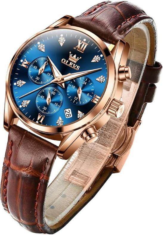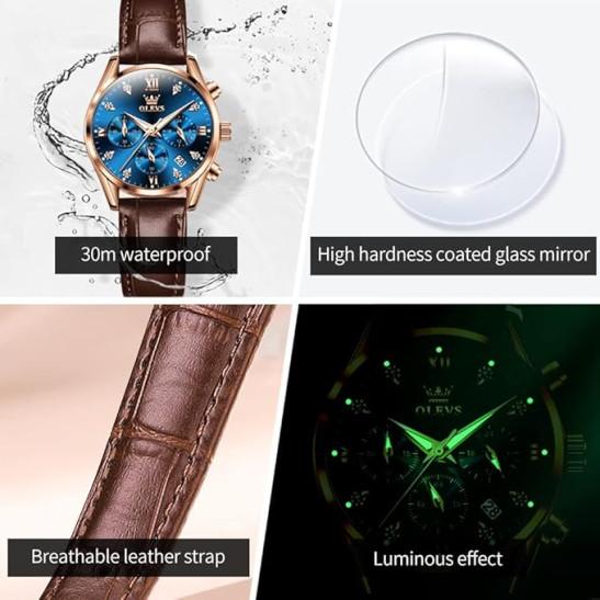 OLEVS Women's Watches Brown Leather Strap Analog Quartz Rose Gold Female Watches Multifunction Chronograph Diamond Waterproof Luminous Ladies