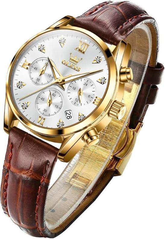 OLEVS Women's Watches Brown Leather Strap Analog Quartz Rose Gold Female Watches Multifunction Chronograph Diamond Waterproof Luminous Ladies