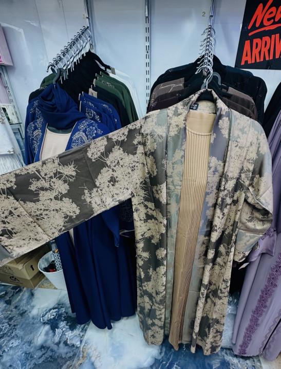 Elegant Sage & Champagne Floral Jacquard Abaya Set Champagne Gold(58) – 3-Piece Pleated Inner & Kimono Wrap