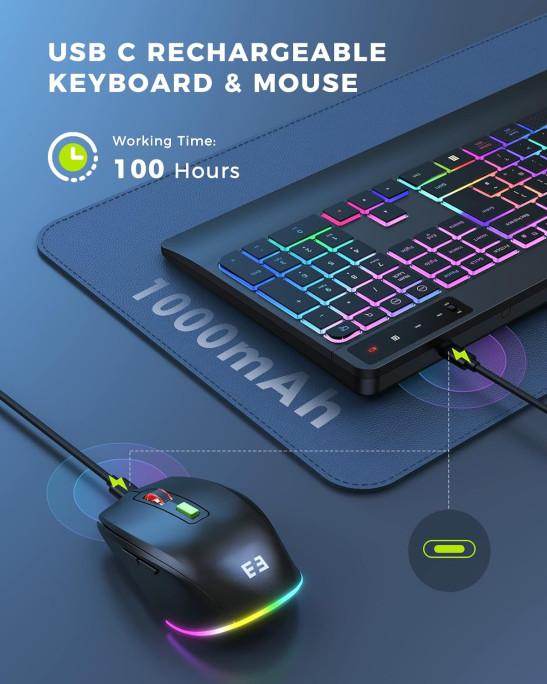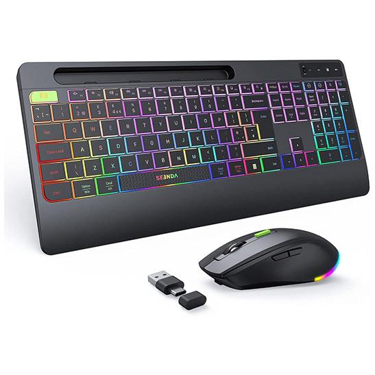 seenda 2.4G Wireless Keyboard and Mouse Combo with Rainbow Backlit, Rechargeable Keyboard and Mice Set UK Layout Full Size with 2 in 1 USB C & USB A Dongle and Wirst Rest, Black