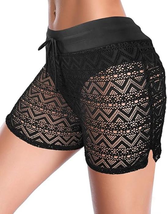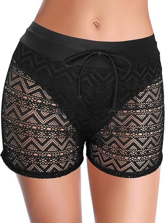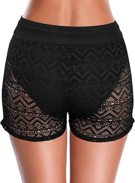SHEKINI Women's Swim Shorts Hollow Out Lace Overlay Bikini Bottom Quick Dry Board Shorts