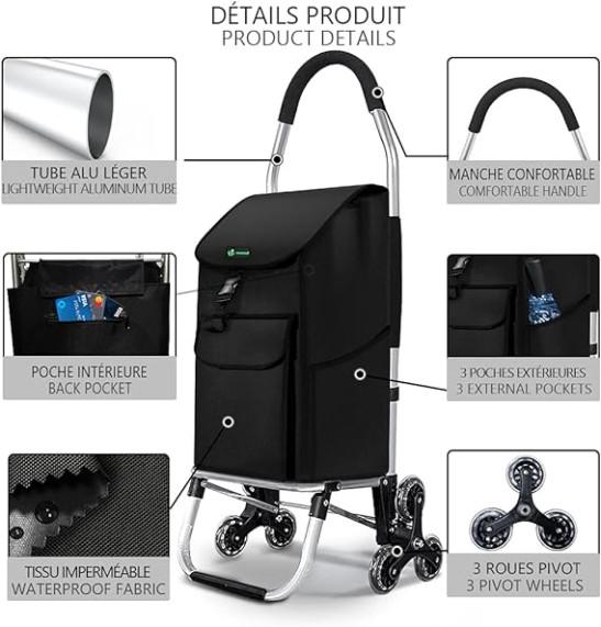 Shopping Trolley on 6 Wheels, Aluminium Lightweight Shopping Cart with Detachable Bag, Stair Climbing Grocery Trolley, 45L, Black