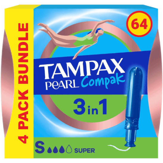 Tampax Compak Pearl Tampons, Super with Applicator, 64 Tampons (16 x 4 Packs)