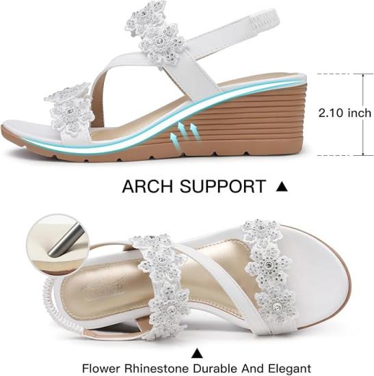 TEMOFON Wedge Sandals for Women Elastic Ankle Strap Bohemian Sandals Open Toe Flower Rhinestone Shoes