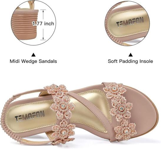TEMOFON Wedge Sandals for Women Elastic Ankle Strap Bohemian Sandals Open Toe Flower Rhinestone Shoes