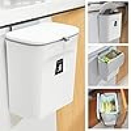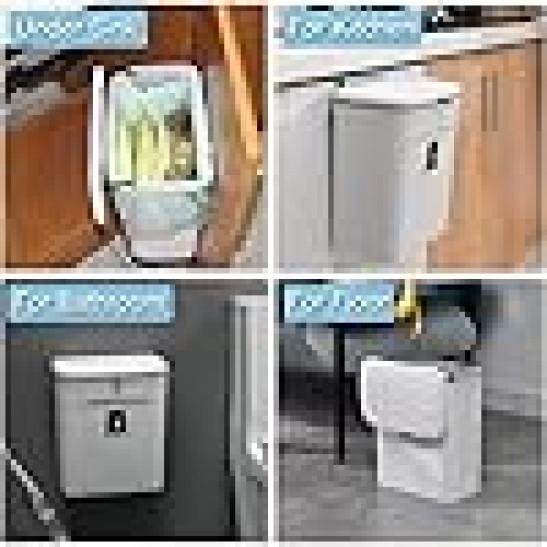Tiyafuro 2.4 Gallon Kitchen Compost Bin for Counter Top or Under Sink, Hanging Small Trash Can with Lid for Cupboard/Bathroom/Bedroom/Office/Camping, Mountable Indoor Compost Bucket, Gray