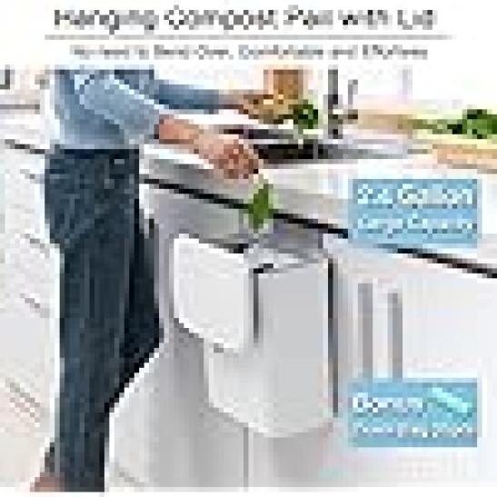 Tiyafuro 2.4 Gallon Kitchen Compost Bin for Counter Top or Under Sink, Hanging Small Trash Can with Lid for Cupboard/Bathroom/Bedroom/Office/Camping, Mountable Indoor Compost Bucket, White