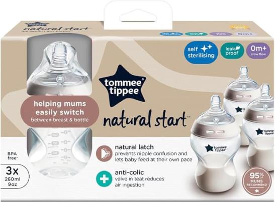 Tommee Tippee Natural Start Anti-Colic Baby Bottle, 260 ml, 0+ months, Slow Flow Breast-Like Teat for a Natural Latch, Anti-Colic Valve, Self-Sterilising, Pack of 3