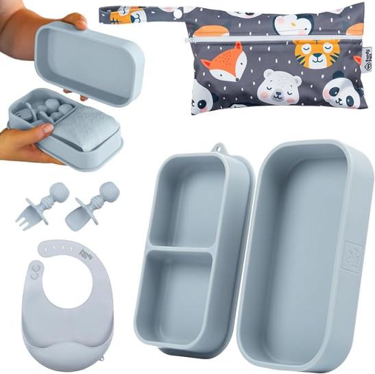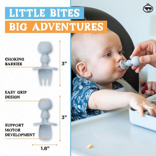Travel Silicone Baby Feeding Set - Portable Toddler Feeding Supplies includes Silicone Baby Spoon & Fork, Suction Plates for Toddler, Lightweight Foldable Baby Bib & Waterproof Storage Bag - 6 Piece Set