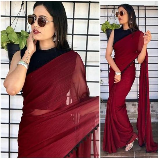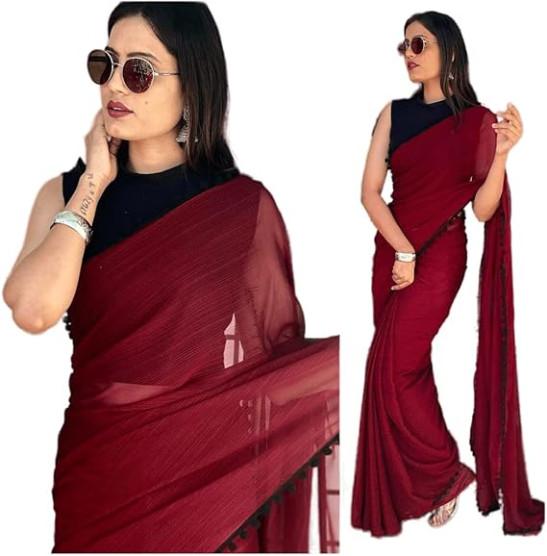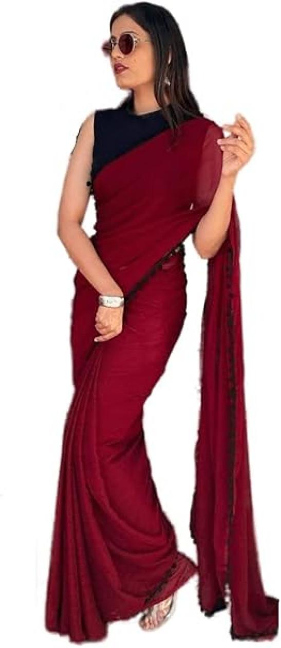 TreegoArt Fashion Women's Georgette Pom-Pom Lace Boardered Saree With Unstitched Blouse Piece