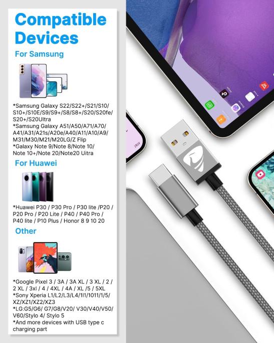USB C Charger Cable 1M 2Pack Type C Charger Fast Charging 3A Lead Nylon Braided for Samsung Galaxy Huawei P30 P20,Google Pixel,Xiaomi,Sony Xperia,Switch