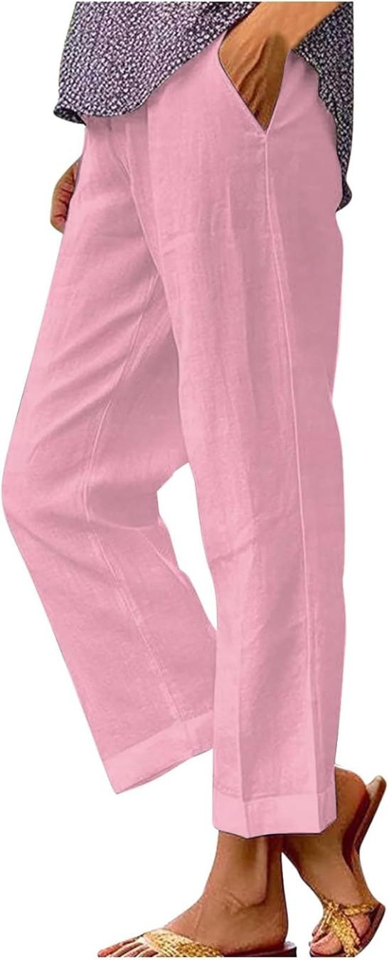 Women Solid Straight Solid Elastic Pants Long Drawstring Linen Women Waist Cotton Casual Pants Leggings with Pockets for Women Plus Size
