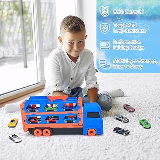Xoolkly Transport Truck Toy Cars for Boys, Portable Race Track Truck Toy Car with 12 Race Cars, Folding Storage 2 Ejection Race Track, Carrier Truck Toys Set for Boys Girls Aged 3 4 5 6, Blue