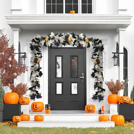2pcs Halloween Garland – 5.74ft Gothic Maple Leaf and Pumpkin Vine with Spider Accents for Spooky Fall & Fireplace Decor
