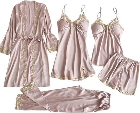 5 Piece Pajama Set Women Sexy Pajamas Set Silk Satin Lace Sleepwear 5 Piece Lingerie Robe Gown Lightweight Nightwear Lace Nightdress Pajamas with Pants Belt Lace Trim Loungewear Gifts for Women Set