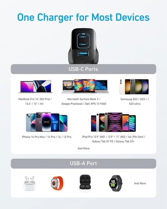 67W USB C Plug, Anker PIQ 3.0 Compact and Foldable 3-Port USB C Charger