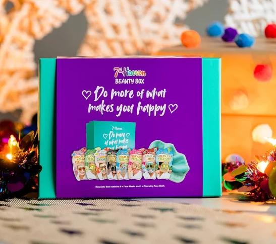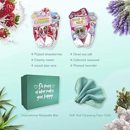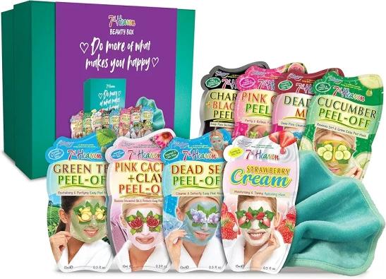 7th Heaven Face Mask Beauty Box Skincare Set - 8 x Face Masks & Soft Cleansing Face Cloth - 6 Variety Peel Off Face Masks, Dead Sea Mud Mask & Strawberry Cream Hydrating Mask - Gift Set with Box