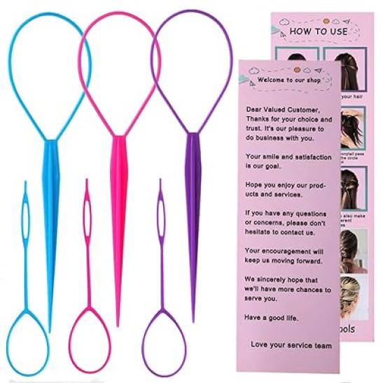 Aigee 6pcs Topsy Tail and Hair Loop Styling Tool Set - Ponytail Makers, French Braid Loops in Large and Small, Hair Pull Through Tools (Pink, Blue, Purple) for Women and Girls