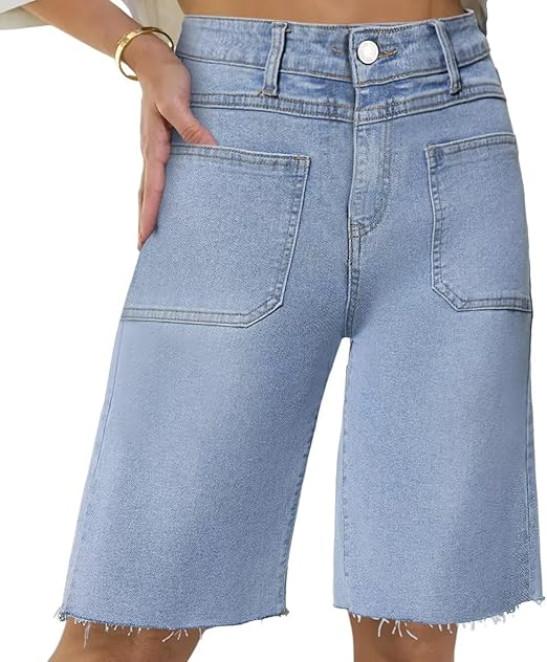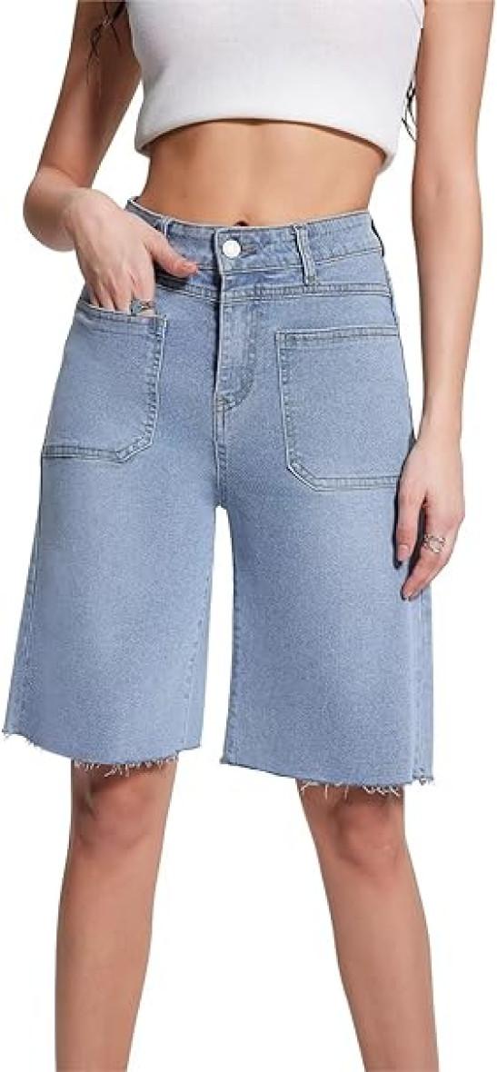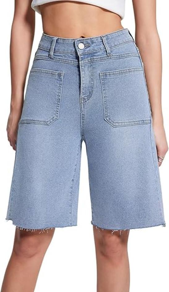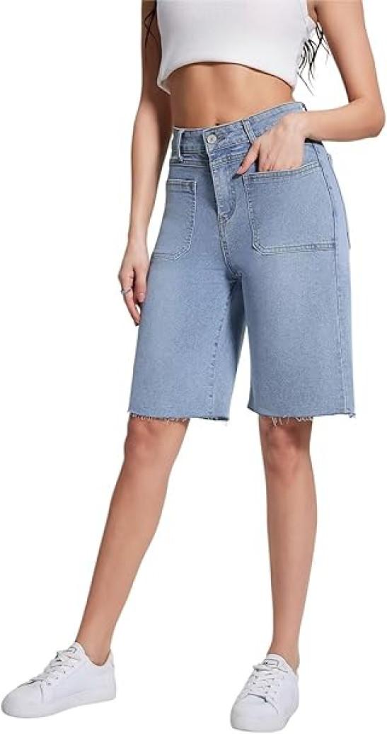 Allimy Womens Front Pockets Denim Long Shorts Jorts Cargo Baggy Bermuda Jean Shorts Knee Length