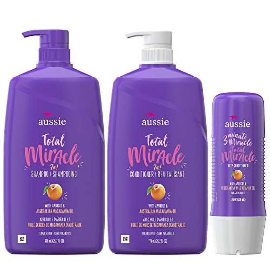 Aussie Total Miracle Hair Care Bundle: Shampoo, Conditioner, and 3 Minute Deep Treatment with Apricot & Macadamia Oil, Paraben-Free for Damaged Hair, 26.2 & 8 Fl Oz
