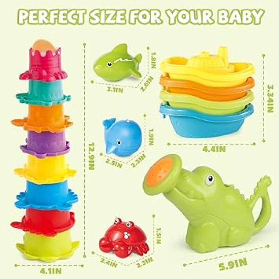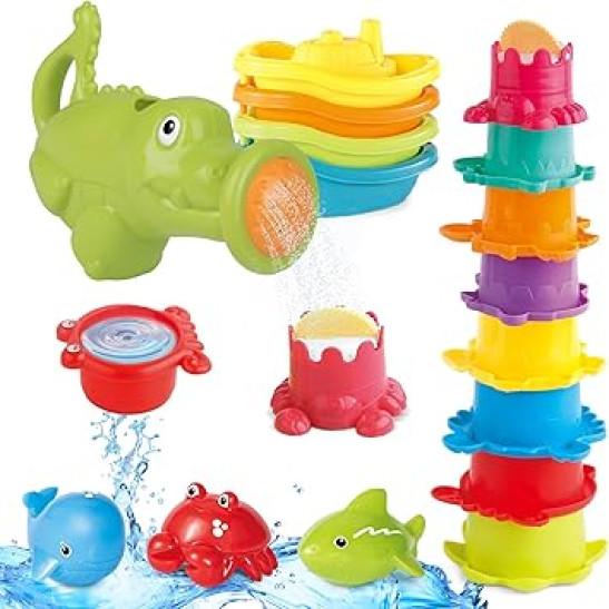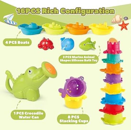 Baby Bath Toys for 1-3 Year Old Toddler, 16PCS Mould Free Water Play Swimming Pool Toy for Kid Age 1 2 3, No Hole Watering Can Stacking Cup Boat for Boy Girl, Shower Summer Gift for Infant 6-12 Months