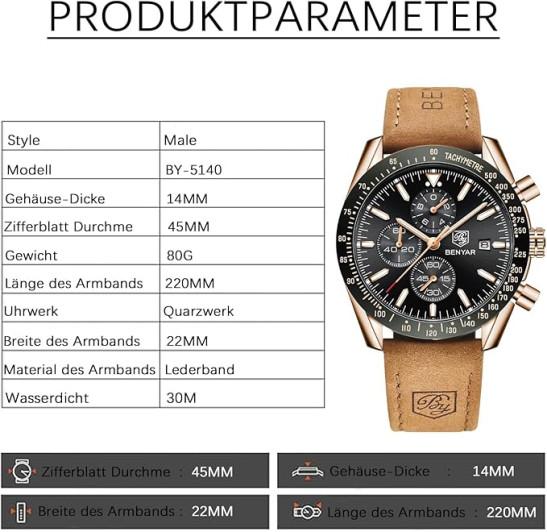 BENYAR Men's Watch Quartz Sports Chronograph Fashion Business Luxury Brand Waterproof Watch Analog Date Men's Brown Leather Watch for Men