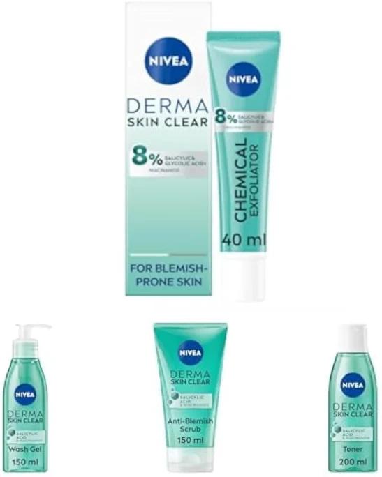 Bundle of NIVEA Derma Skin Clear Chemical Exfoliator (40ml), Deep Cleansing Salicylic Acid Face Wash, NIVEA Derma Skin Clear Scrub & NIVEA Derma Skin Clear Toner (200ml),